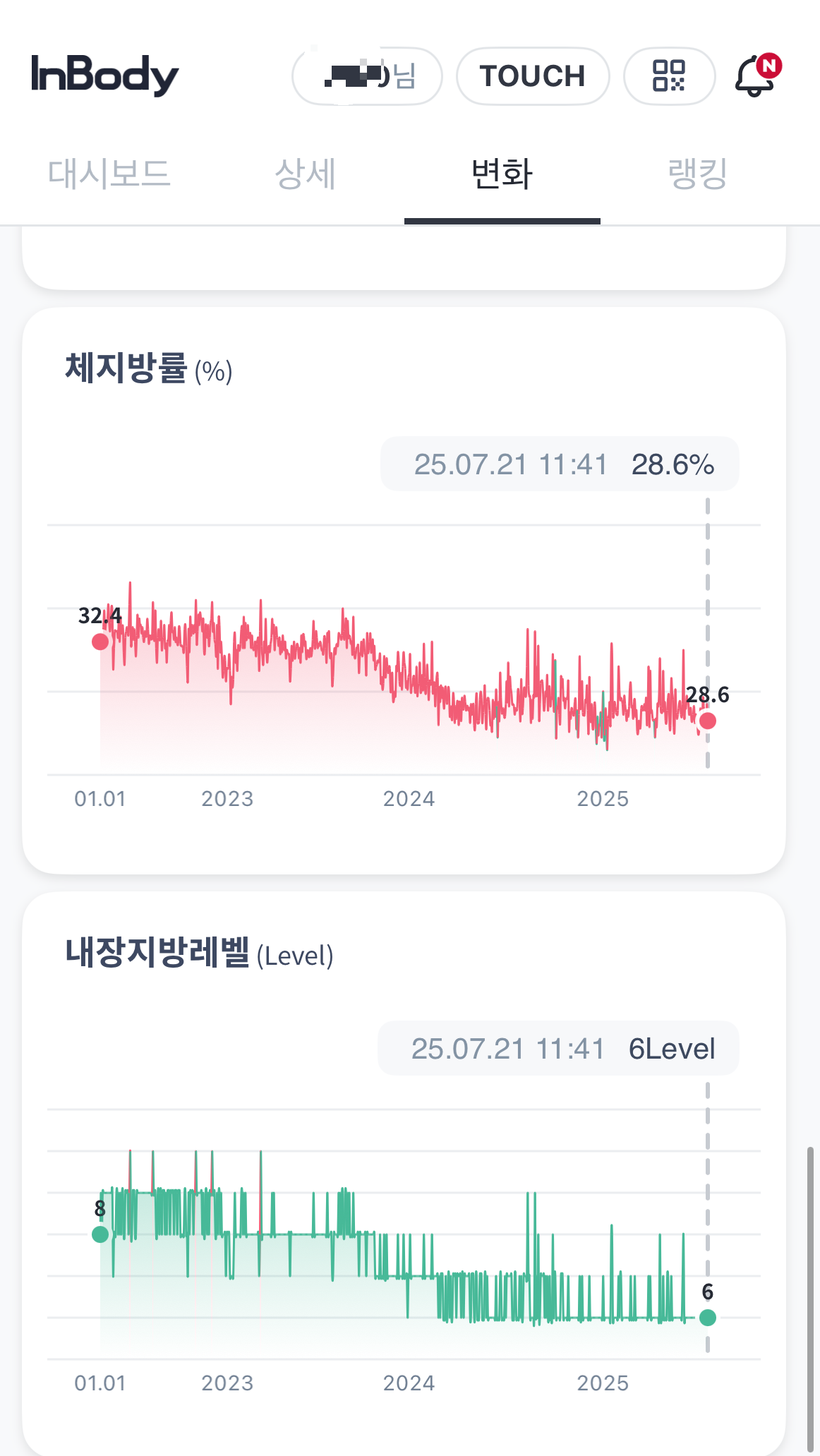 특히 내장 지방 레벨이 8까지 갔다가 6으로 내려왔어요.