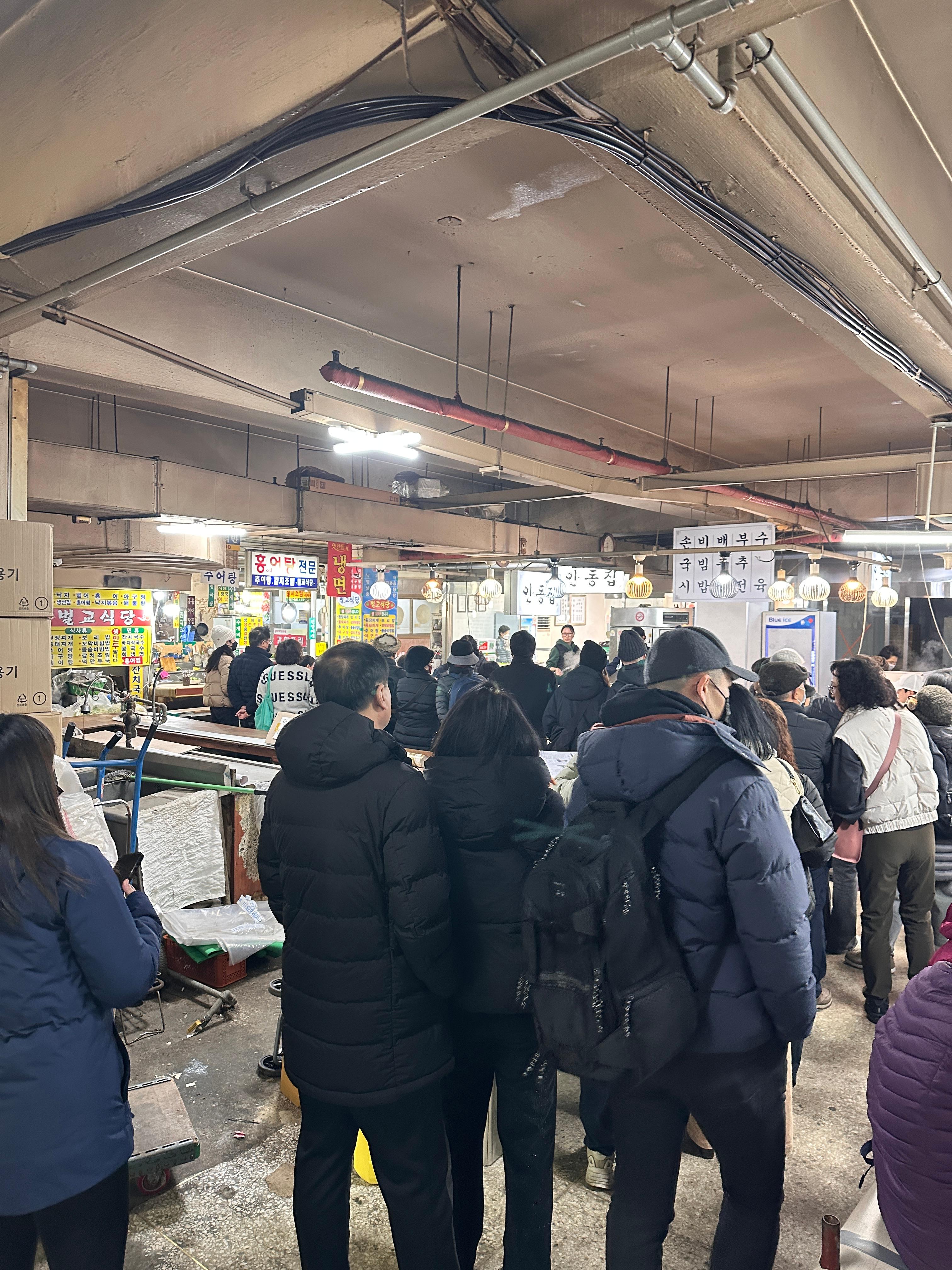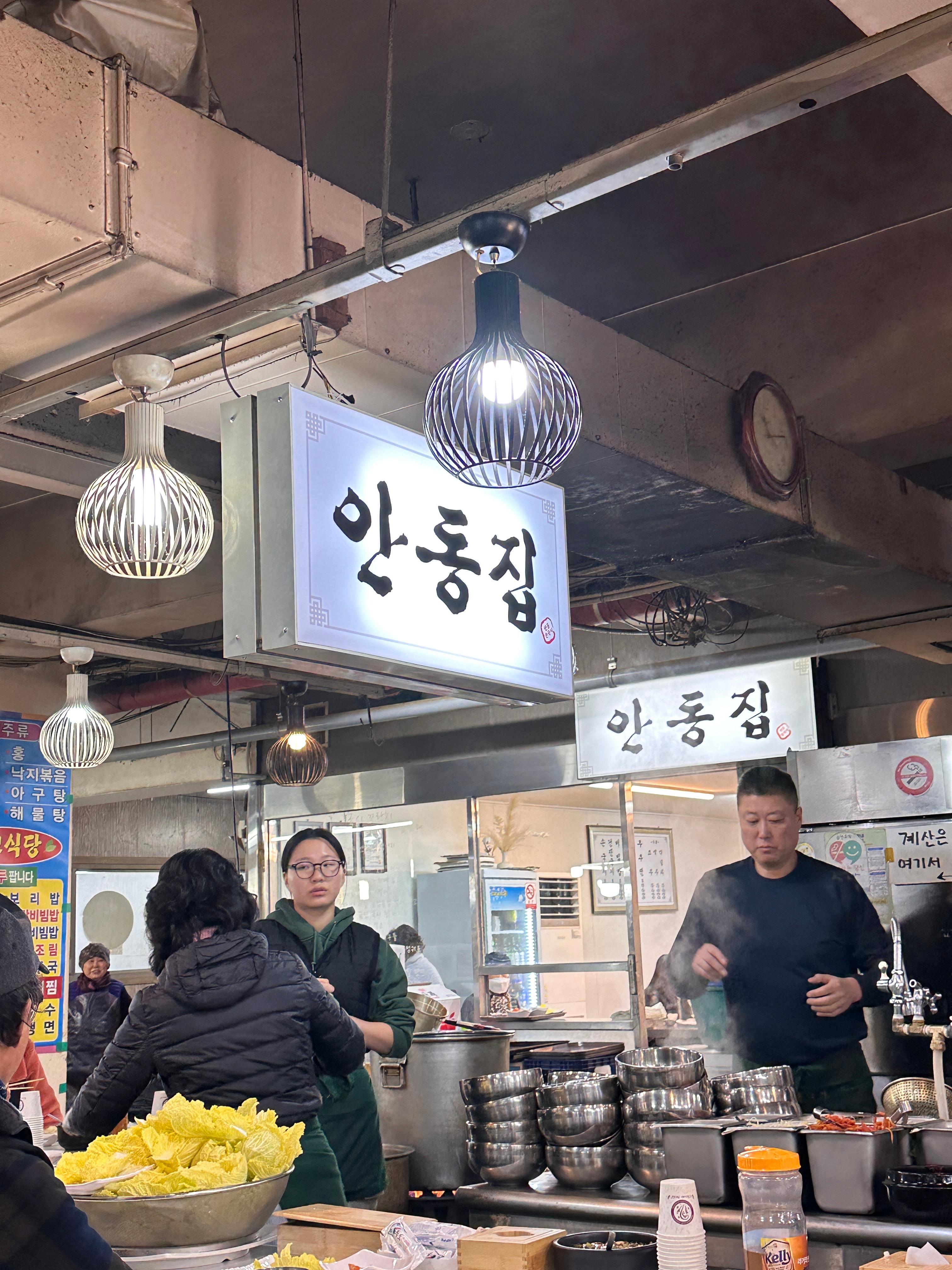 안동집만 줄이 있는데, 그곳까지 가는데,  손님 없는 가게들을 지나가며 괜히 민망하고 미안한 마음이 든다. 속으로 '다음에 올게요'라고 말하고, 안동집에 줄을 섰다. 도착 시간은 11시 15분 내 앞에 2팀 있었는데, 1분도 안되어 우리 보고 들어오란다. 앞에 2팀은 아직 일행이 안 왔다며, 우리 먼저 들어오라 신다. 시장 내에 오픈된 자리도 있지만, 실내 쪽에도 넓은 홀이 있다.  요즘은 겨울이니 안쪽자리가 춥지 않고 좋다.