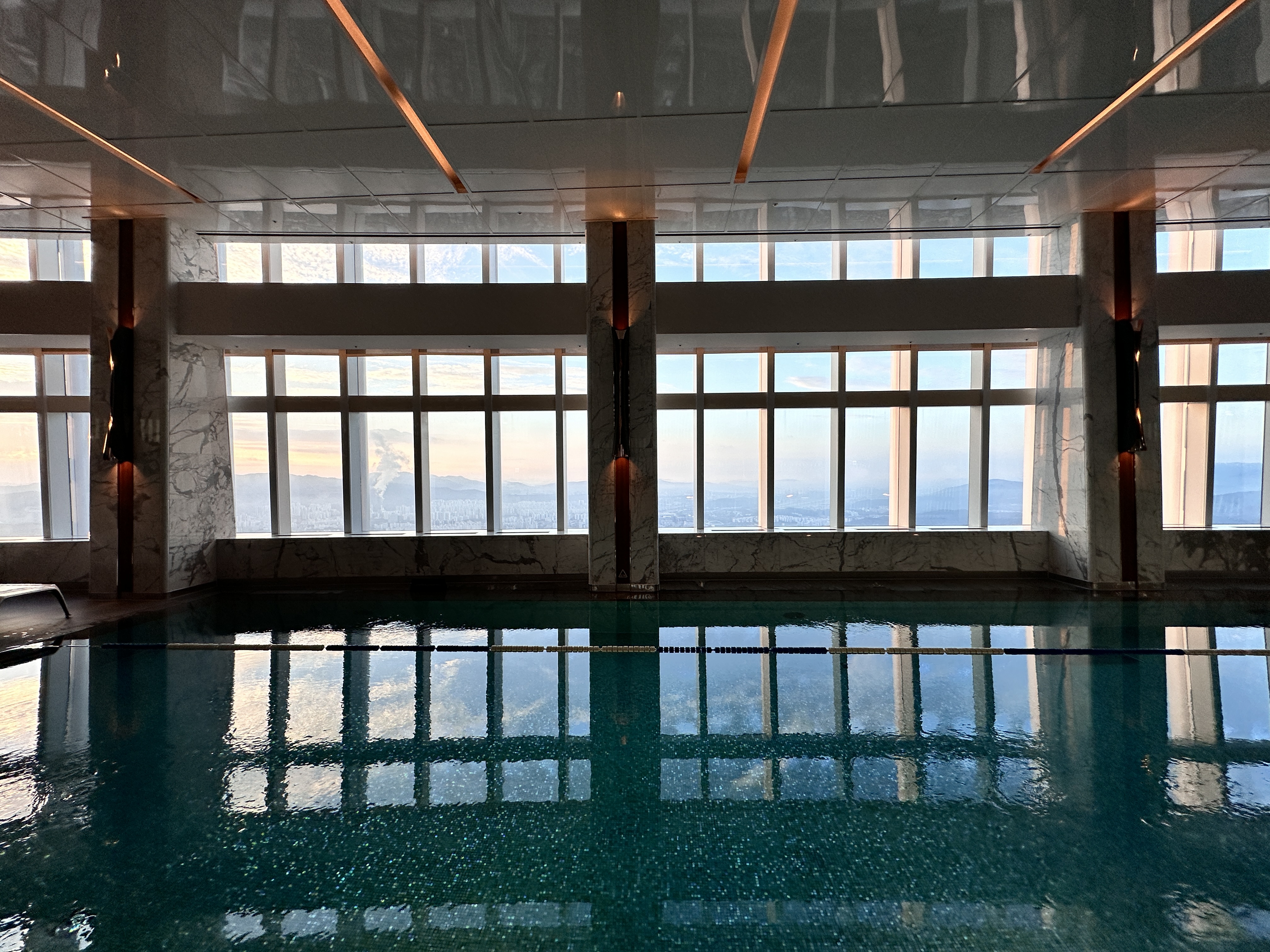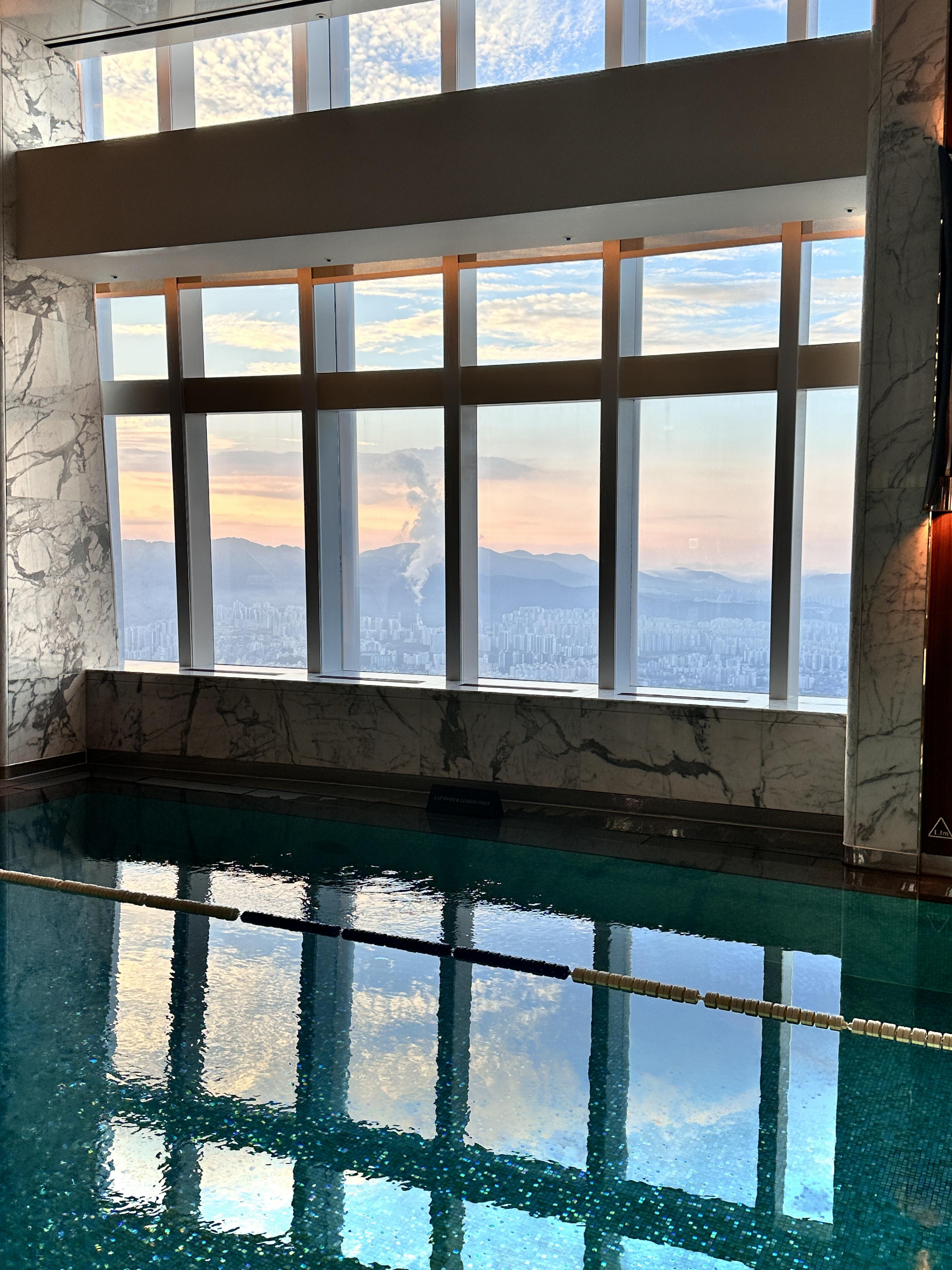 호텔 수영장치고 작다는 이야기를 들었는데, 작은 것 빼고는 모두 만족. 제가 수영장에 간 시간은 6시 30분이었어요. 탈의실이 좁으니 룸에서 수영복 입고 가라는 얘기도 있던데 아무리 가운을 걸쳐도 그건 도저히 못하겠더군요. 이른 시간에 갔기 때문에 좁은 탈의실이지만 혼자 쓰기엔 넉넉했음. 샴푸와 바디워시는 딥티크는 아님. 드라이어가 다이슨이었는데, 룸이나 부대시설 모두 최상급으로 맞춰주시길 혼자 바라 봅니다. 수영장은 총 3개의 2개의 레인인데, 하나는 쉼 없이 수영하실 분들을 위한 레인이고, 좀 넓은 레인은 노닥거리며 수영하라 사람들을 위한 레인이다. 안전 요원이 한 분 계시고, 수영모자 빌려드릴까요? 라며 물어보는데 난 필요 없었음.