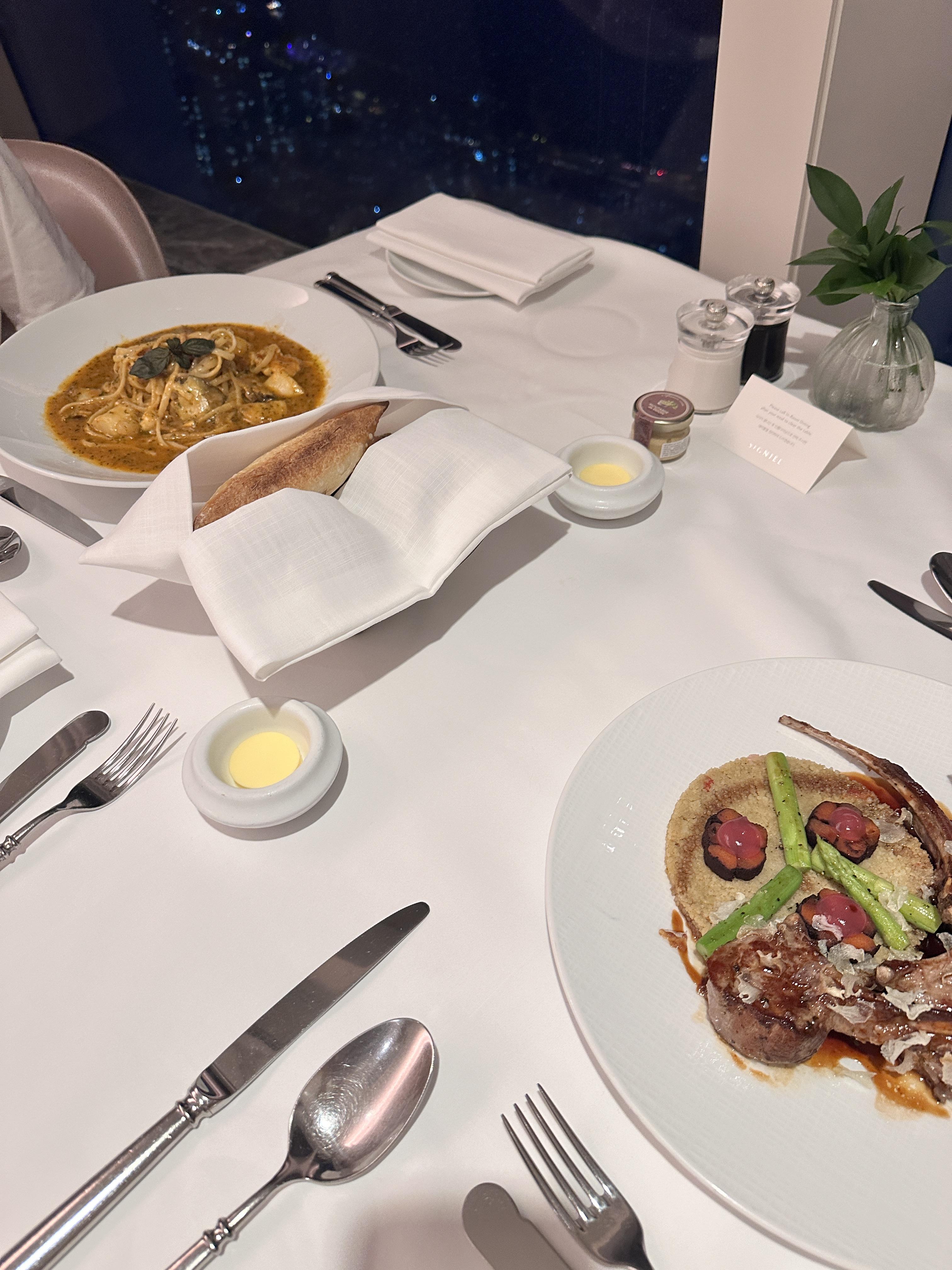 1차는 룸 서비스 - 하는데까지 해보자고 저녁은 룸서비스를 먹었는데, 양갈비와 파스타 조합에 롯데마트에서 사 온 스테이크를 곁들였다. (롯데마트에 스테이크 구워주는 서비스가 있다. 호텔 손님들 겨냥한 것인지.. 참 유용하다) 이동식 테이블을 가져와서 어느 위치에 놓을지 물어봐 주고, 테이블 세팅과 음식 세팅 후 설명해 주고 가신다. 야경 보면서 격식 차리지 않고 가족끼리 편하게 먹을 수 있기 때문에 룸서비스 추천합니다.